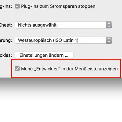 3. Wählen Sie die Option "Menü Entwickler in der Menüleiste anzeigen" mittels Haken aus. Dadurch sollte der entsprechende Punkt jetzt im Hauptmenü sichtbar werden.