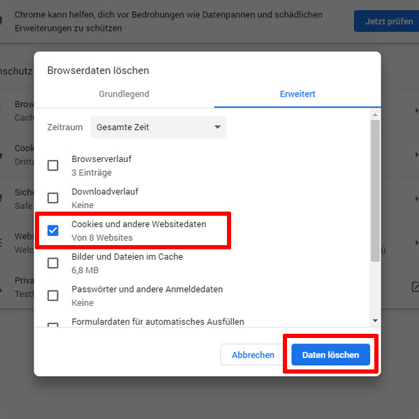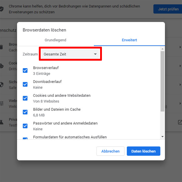 - Daraufhin öffnet sich das neue Fenster "Browserdaten löschen".